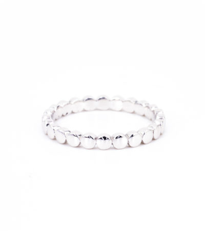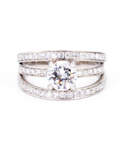 J’ai travaillé sur un corps fin, délicatement perlé, afin d’y apporter une touche plus sophistiquée. Les pierres sont serties clos pour se fondre dans ce corps tout en rondeurs. De cette base, j’ai ainsi décliné différentes options, épaulées ou non de diamants, seuls ou en trio.