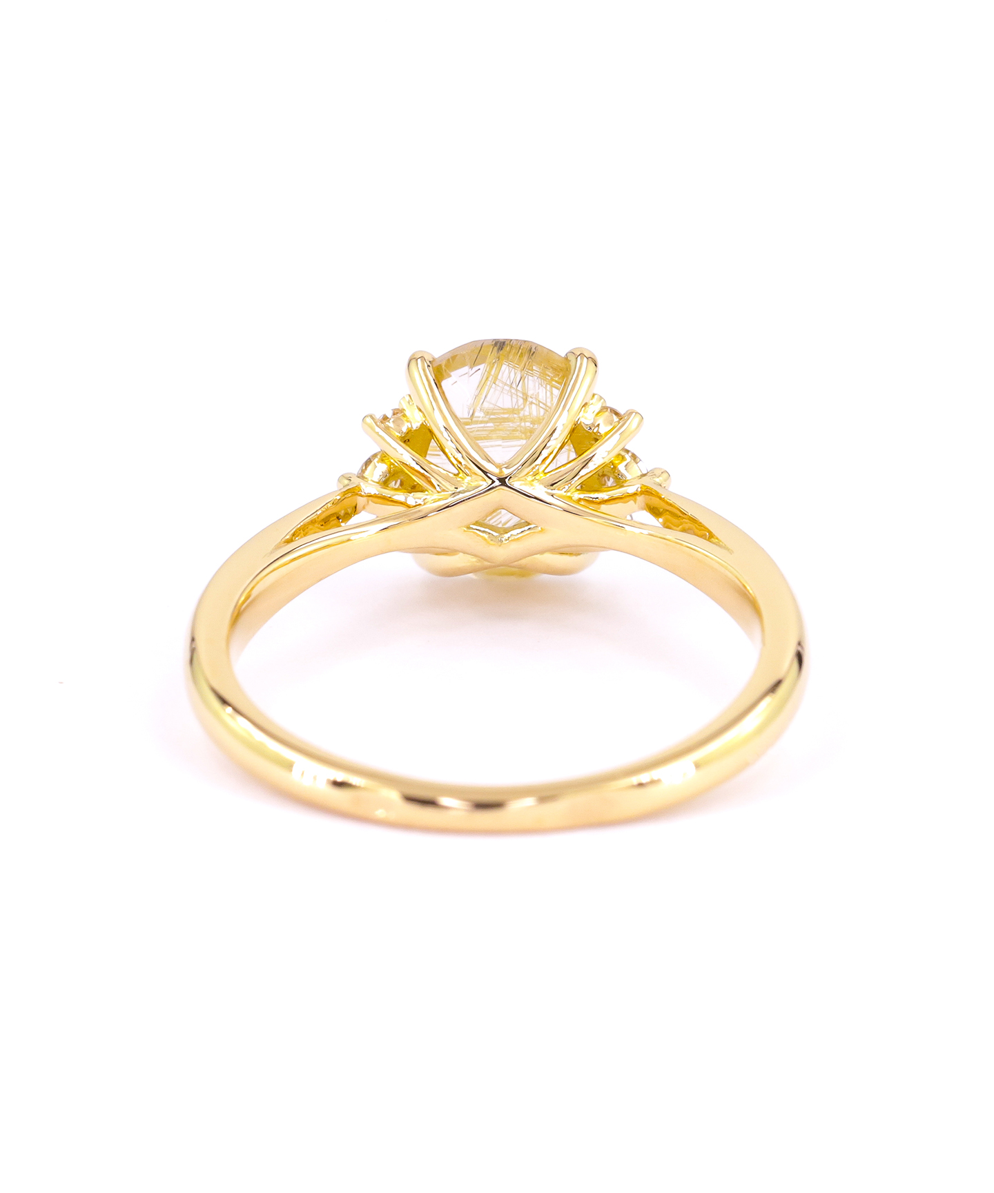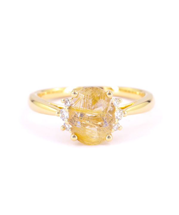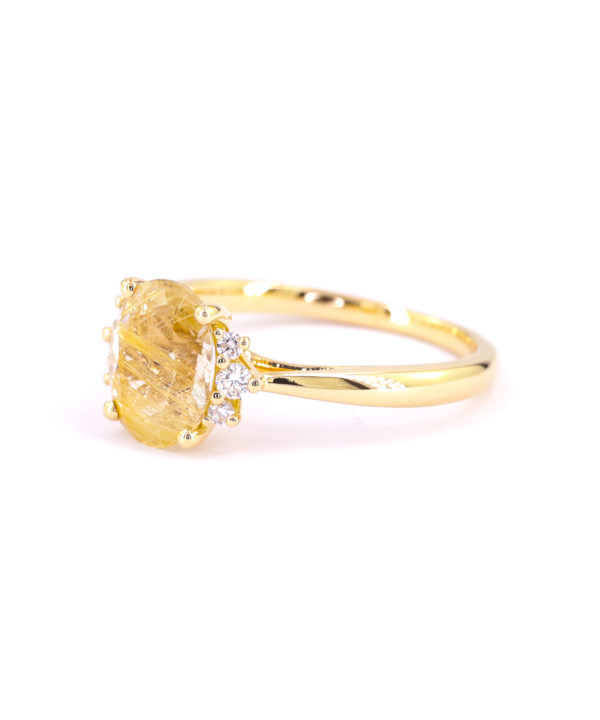 J’ai ainsi réfléchi à des bijoux jouant sur les couleurs et textures d’or, pour accentuer la couleur des rutiles. Sur certains modèles, j’ai également apporté une touche de lumière grâce à quelques diamants entourant partiellement le quartz.