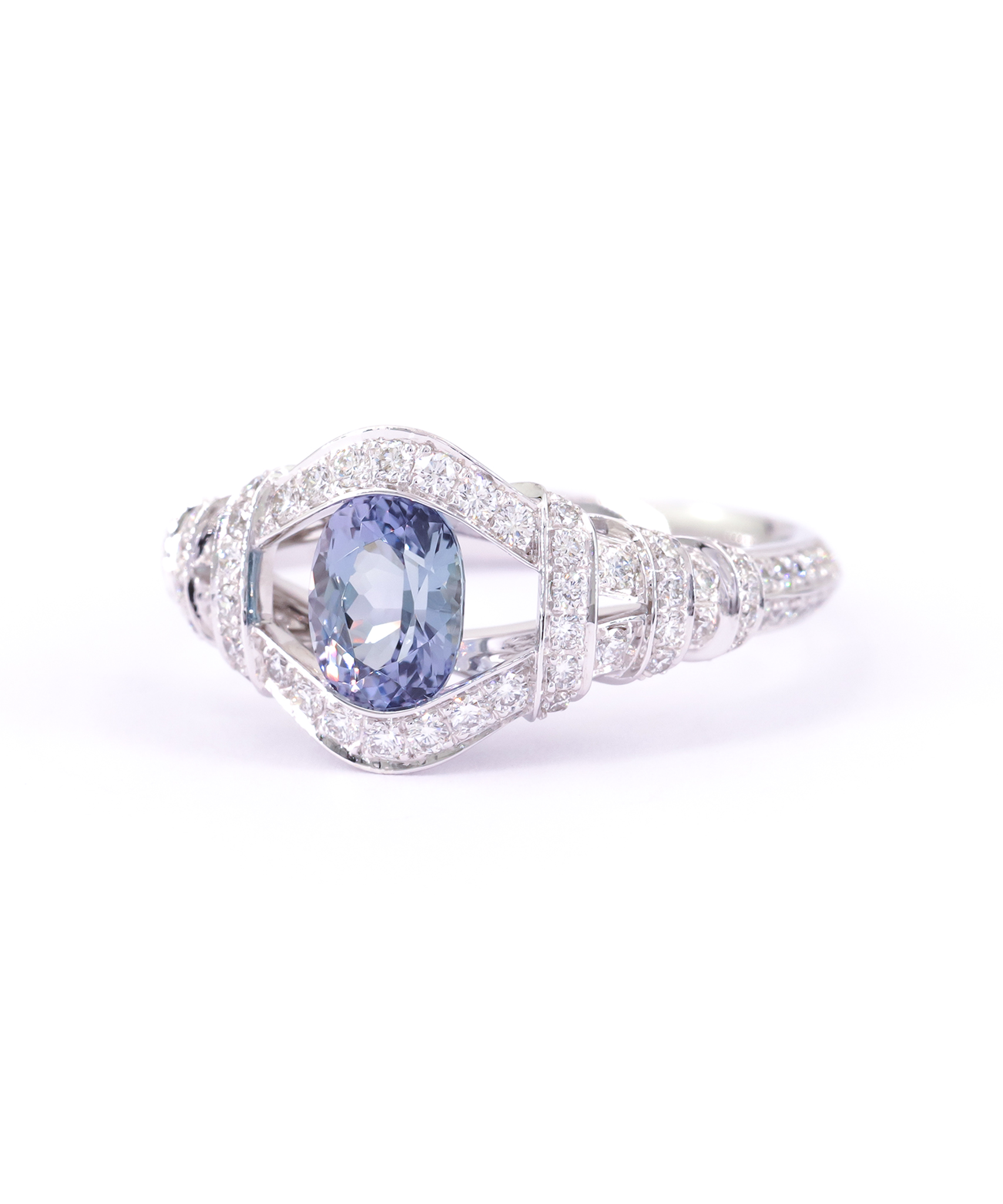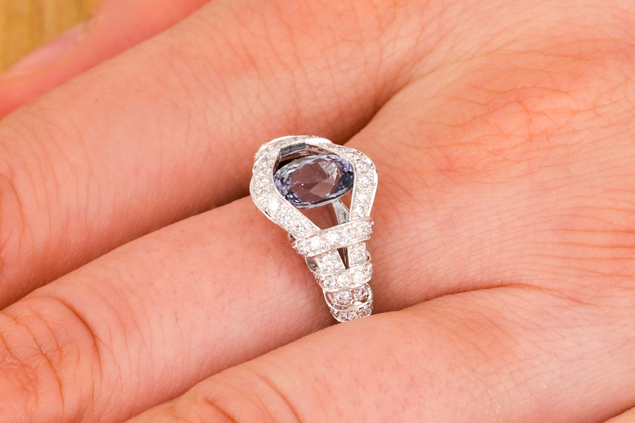 J’ai ainsi travaillé sur un corps pavé de diamants, qui vient étreindre la tanzanite non chauffée avec un serti mi-clos. Des liens viennent ensuite rapprocher, l’un contre l’autre, ce serti mi-clos pour finir par créer le corps de bague. Afin d’accentuer le graphisme de la bague, nous avons utilisé la technique de serti de pavage dite « grain » qui dessine une ligne d’or sur les flancs des pierres et vient finir de structurer la création ! »